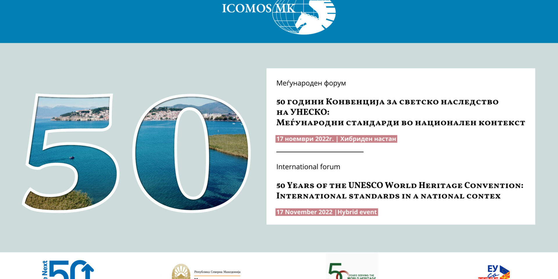 По повод 50-годишнината од усвојувањето на Конвенцијата за заштита на светското културно и природно наследство на УНЕСКО (Конвенција за светско наследство), Националниот комитет на ИКОМОС Македонија на 17 ноември 2022 год. ќе организира Форум на тема ,,50 години Конвенција за светско наследство на УНЕСКО: Меѓународни стандарди во национален контекст“. Настанот се организира со финансиска поддршка од Министерството за култура на Република Северна Македонија, а ќе се одржи со физичко присуство во Europe House – Скопје и виртуелно преку платформата ZOOM.