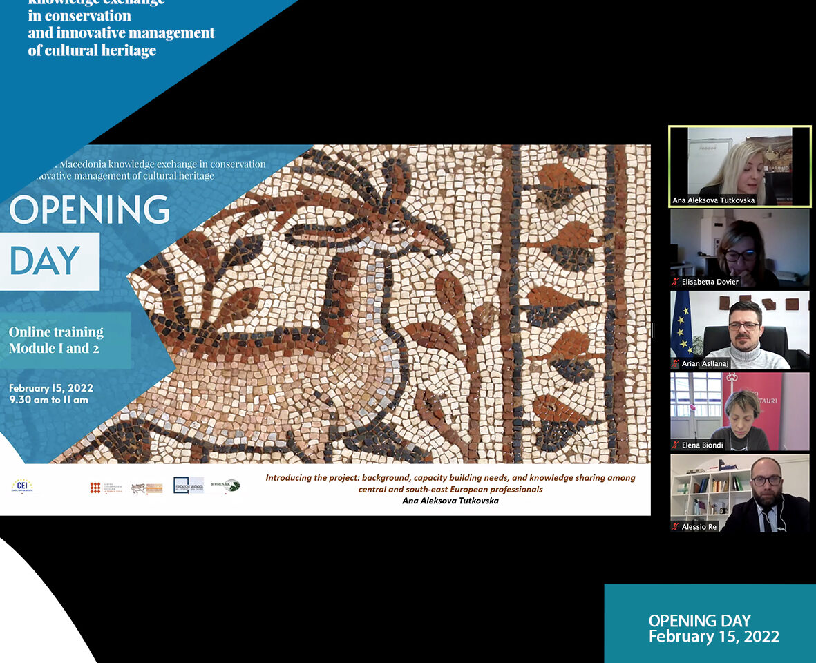 Настанот кој се одржа виртуелно беше отворен од страна на г-ѓа Елисабета Довиер, проектен менаџер од Централноевропската иницијатива која во своето обраќање ја истакна улогата на ЦЕИ за одржливиот развој преку поддржување регионална соработка и особено нивниот интерес да продолжат со поддршка на проекти за културното наследство во регионот.