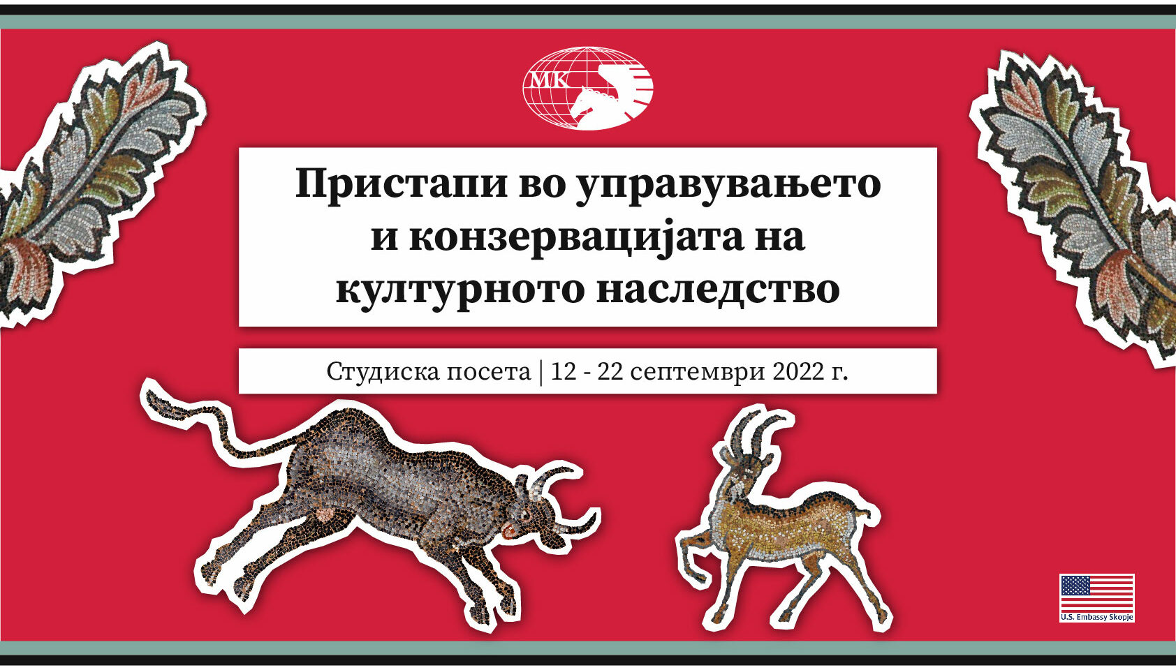Националниот комитет на ИКОМОС Македонија со задоволство ја најавува студиската посета на тема ,,Пристапи во управувањето и конзервацијата на културното наследство“ која ќе се спроведе од 12 до 22 септември 2022г., со финансиска поддршка од Амбасадата на Соединетите Американски Држави во Скопје.